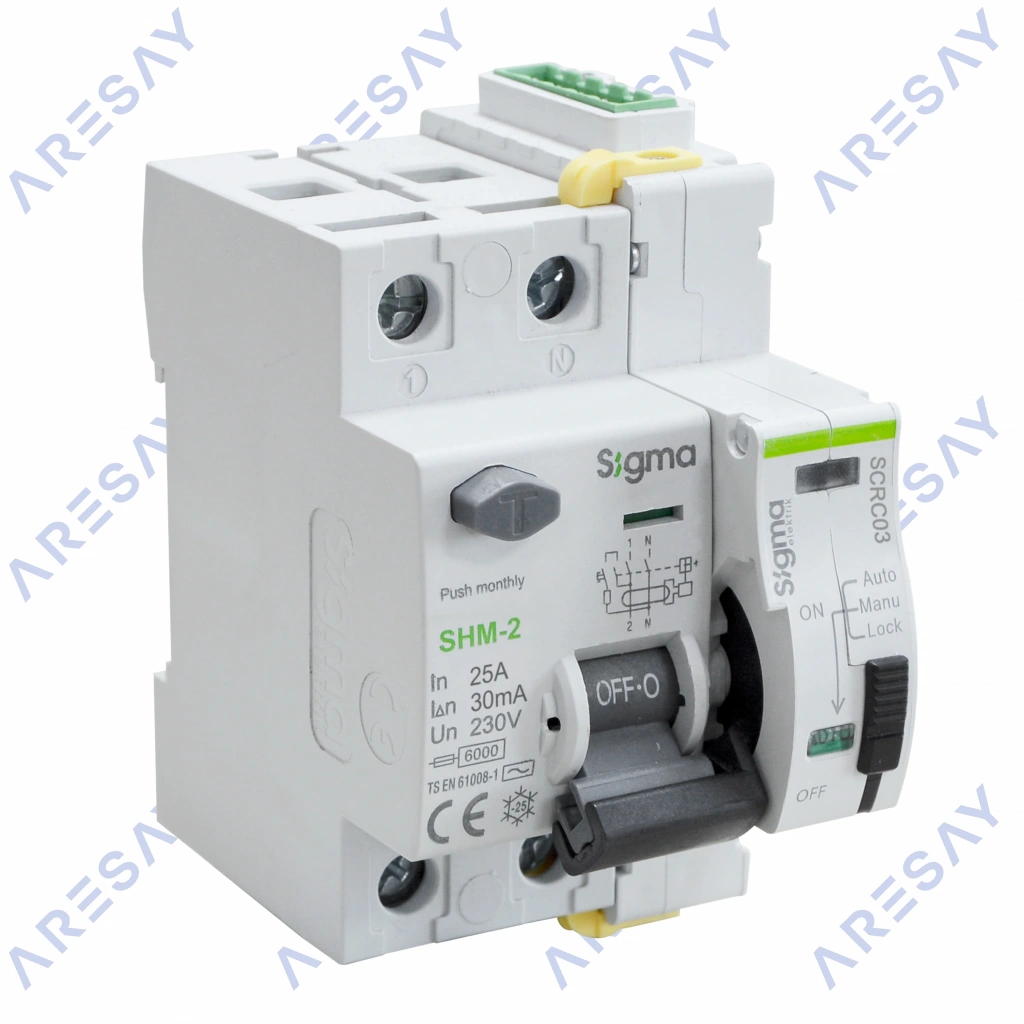 Kaçak akım koruma şalteri otomatik yeniden kapama ünitesi SCRC03 ve SHM2025030 2x25 30mA 6kA Kaçak Akım Rölesi